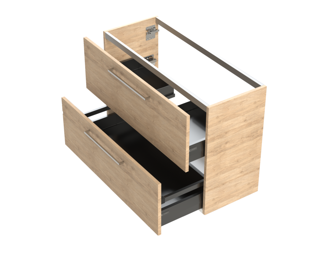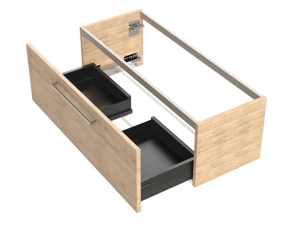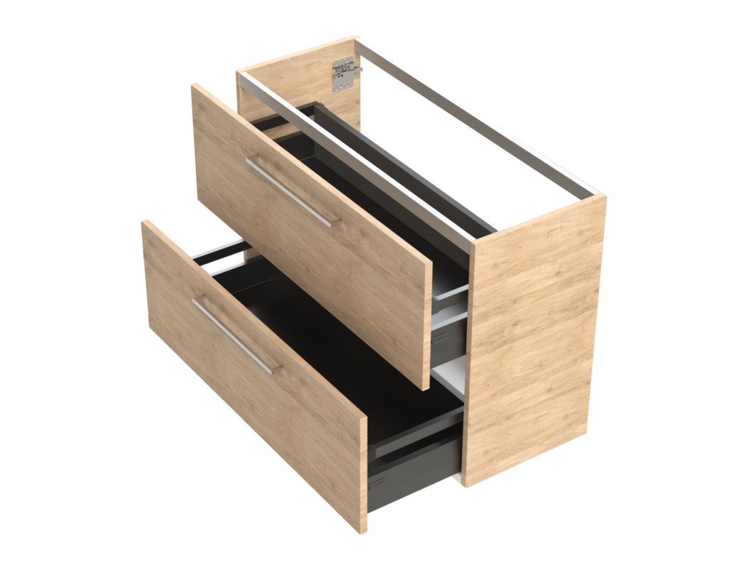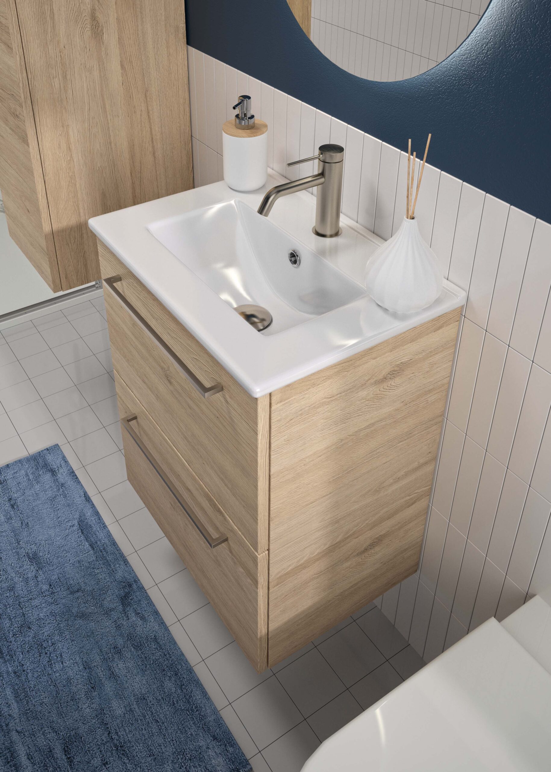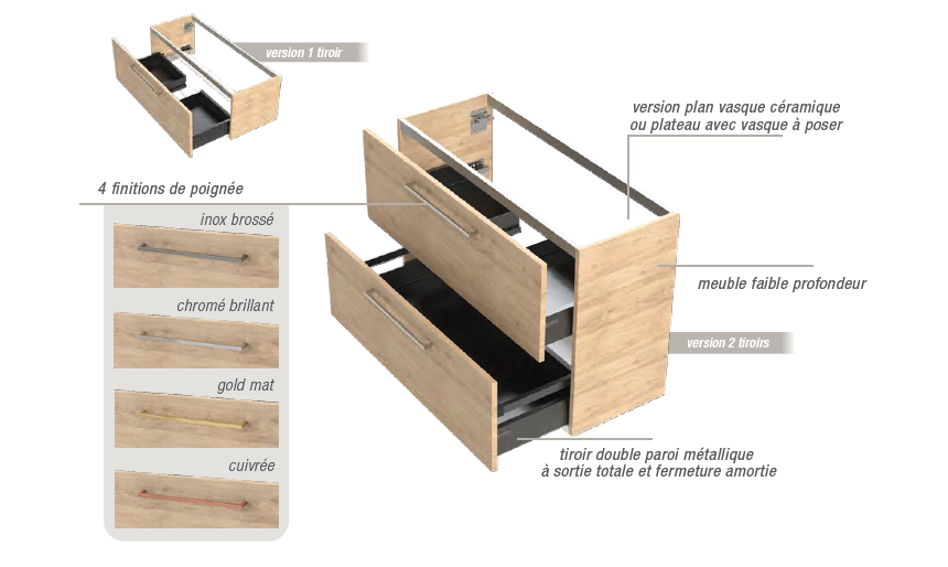 Grâce à sa faible profondeur (36 cm), ce meuble gain de place permet d’optimiser l’espace dans la salle de bain. Disponible tous les 10 cm de 50 à 120cm, dans 2 configurations : 1 ou 2 tiroirs.