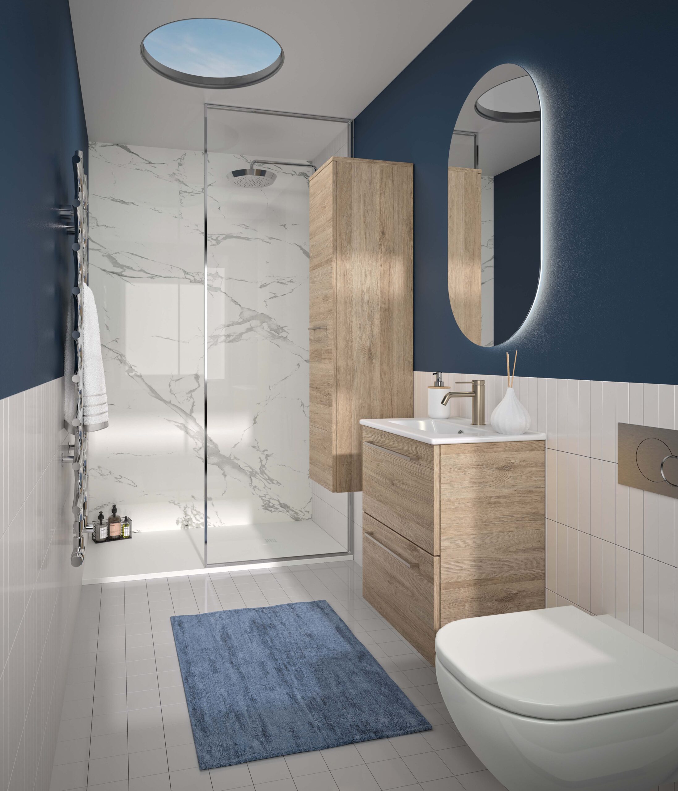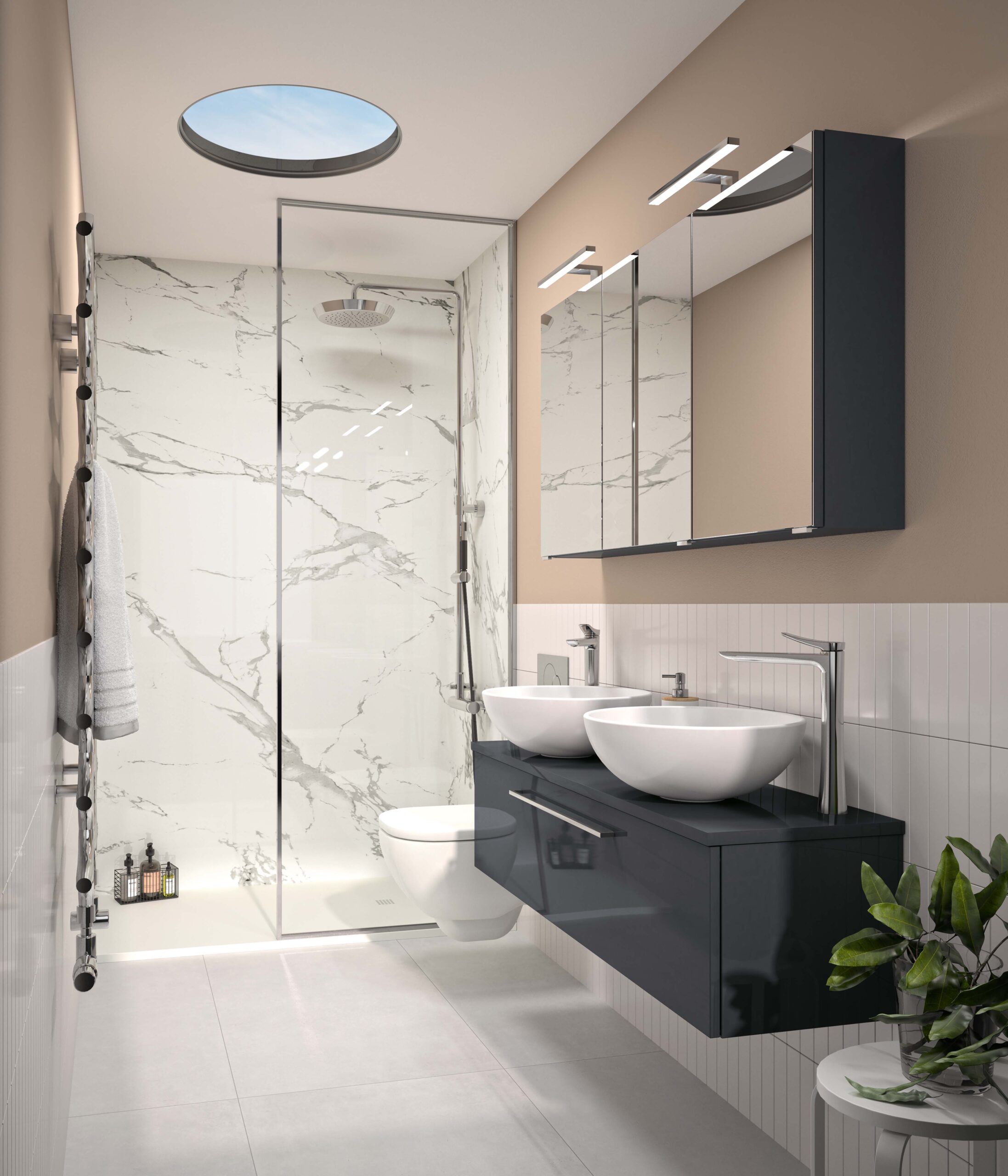 Astucieux, Optima est la solution idéale pour les salles de bain étroite.