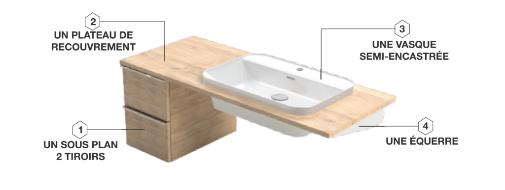 Pour une utilisation non PMR, ajoutez un meuble bas 2 portes sous votre plan vasque pour profiter de plus de rangements.