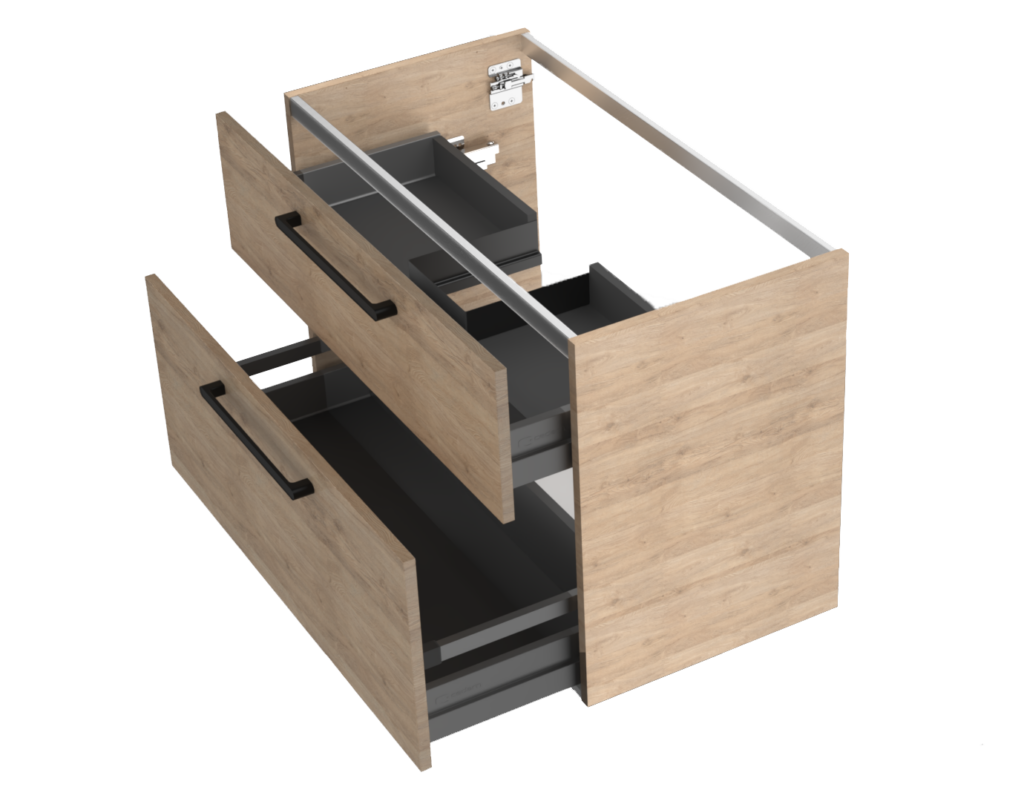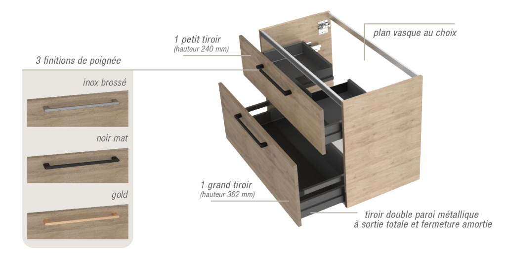 Le meuble Soho un rangement optimisé grâce à un grand tiroir spacieux et un plus petit pour les essentiels du quotidien.