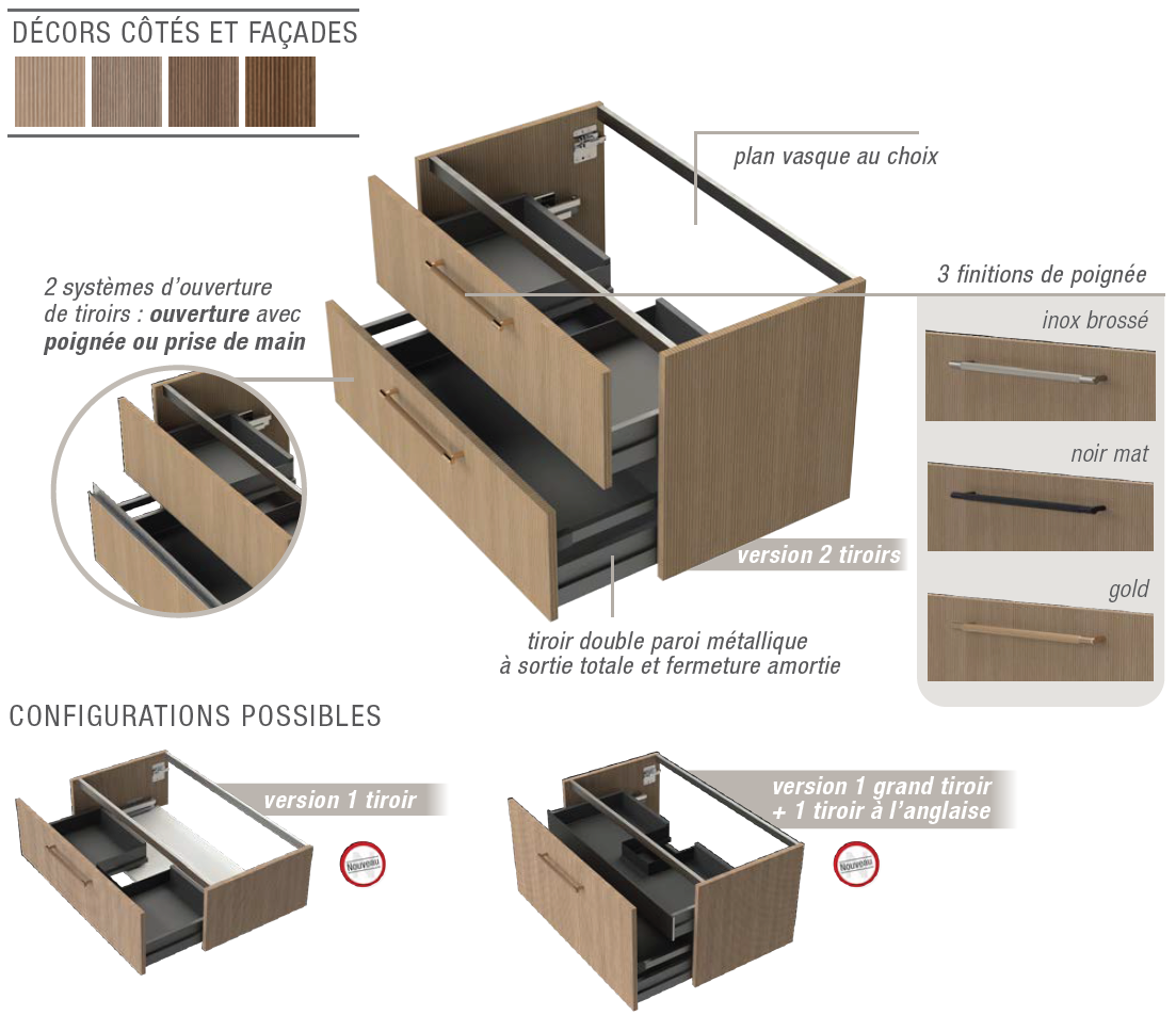 Facades available in 3 wood decors to suit every bathroom am- biance.