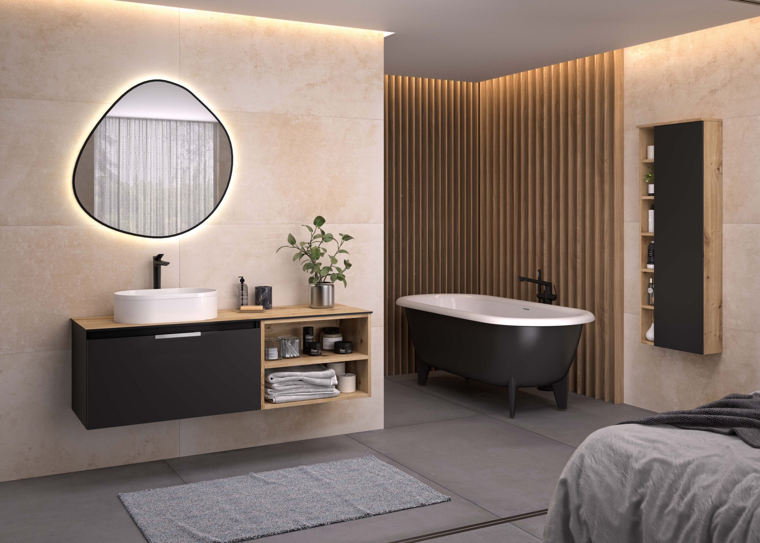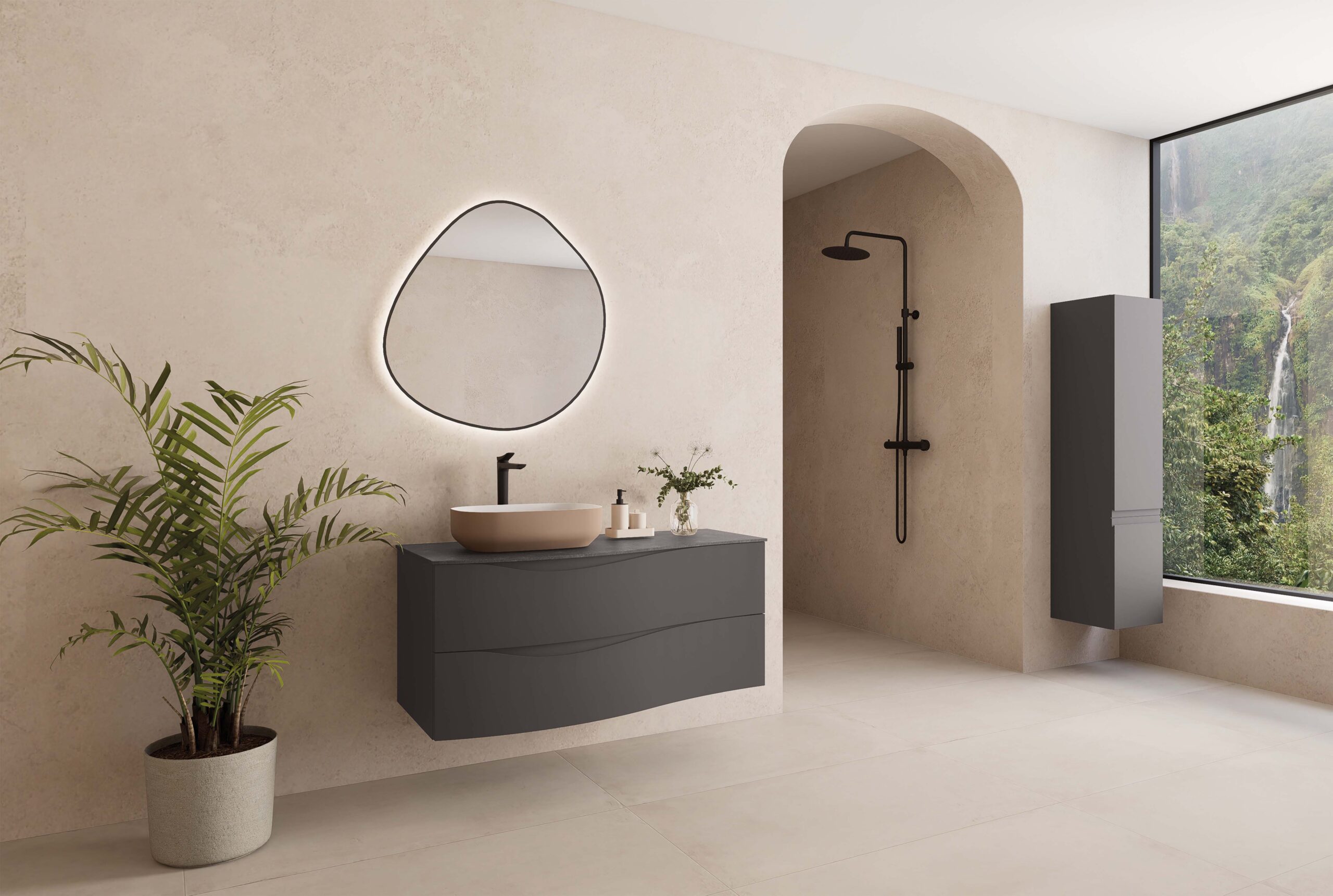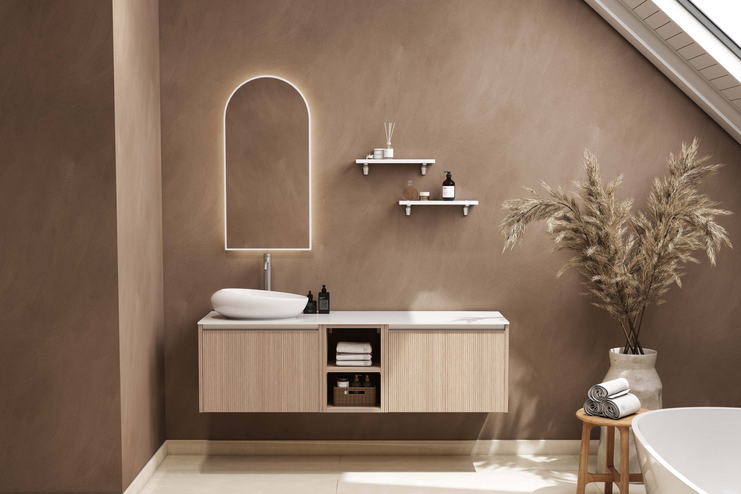 Miroir 4mm en forme organique sérigraphié sur armature silicone en retrait intégrant LED périphérique. Ruban LED 6,5 W/m, câblé avec transformateur. Pose possible dans les 4 sens.