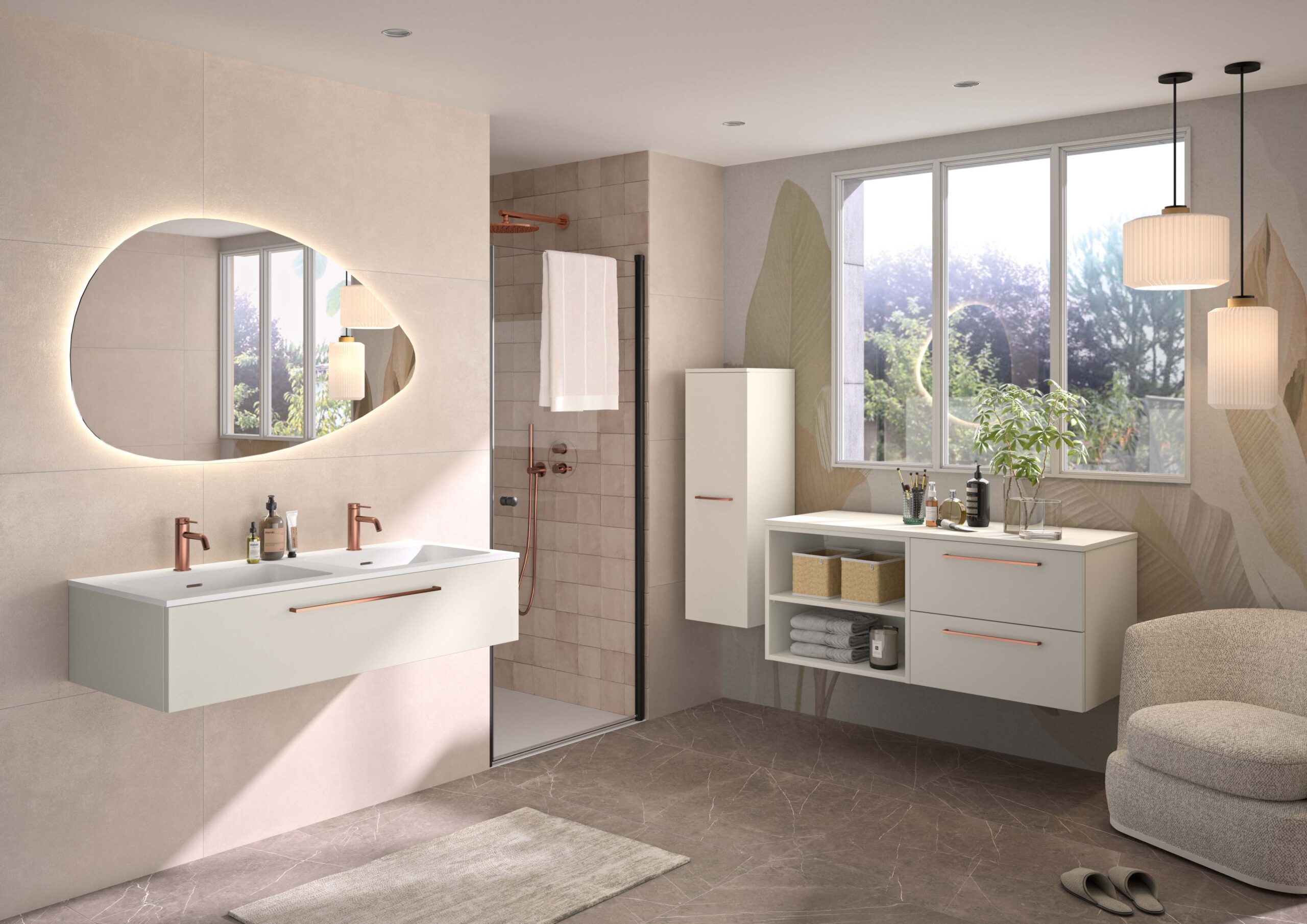 Miroir 4mm sur profil aluminium en retrait intégrant LED périphérique protégée par un couvercle transparent. Ruban LED 10 W/m, câblé avec transformateur. Système anti-buée avec extinction automatique au bout de 30 minutes.