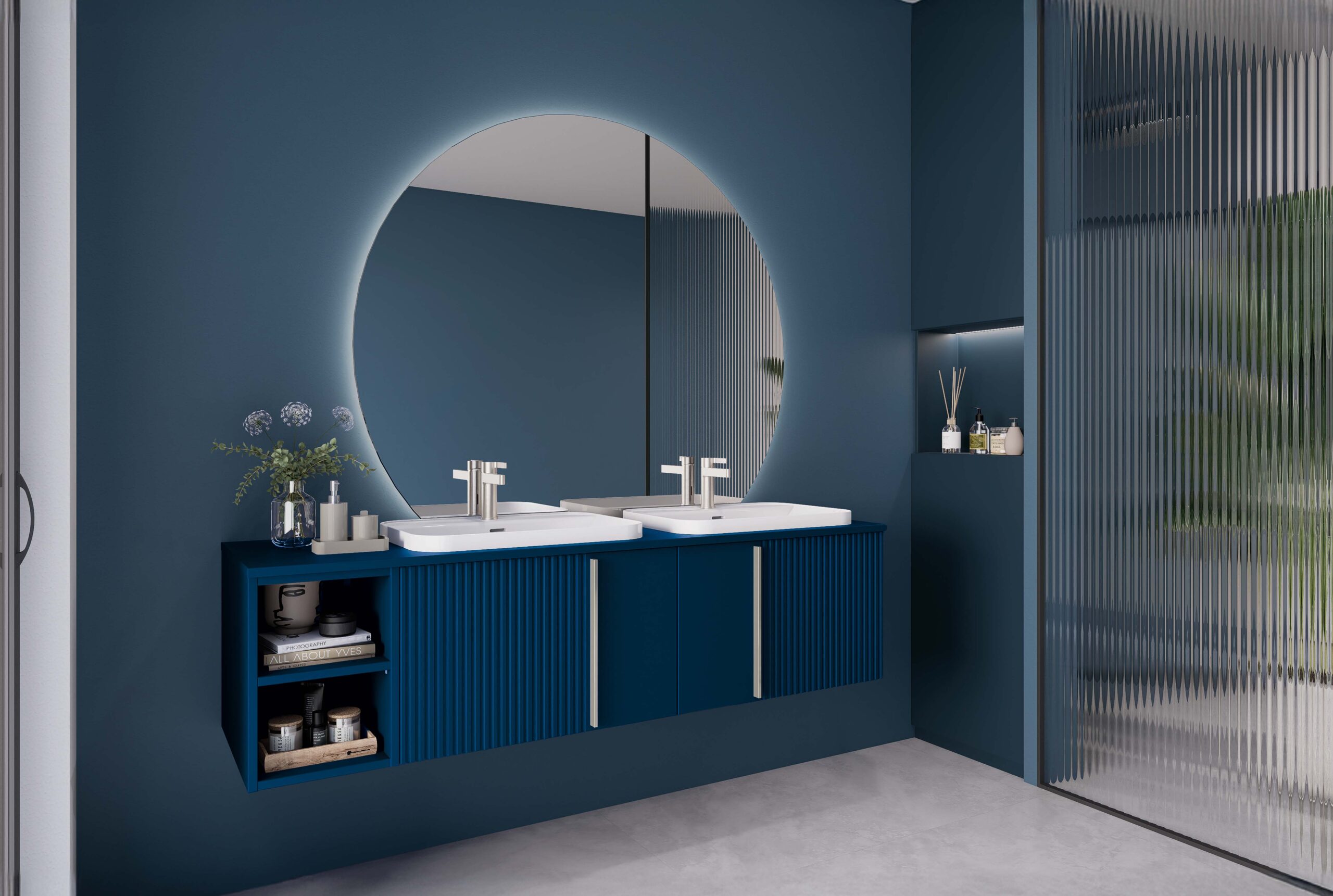 Miroir double rond épaisseur 4mm sur cadre aluminium cintré en retrait de 65 mm intégrant une LED périphérique protégé par un couvercle transparent. Système antibuée intégré. Ruban LED câblé avec un transformateur classe II IP44.