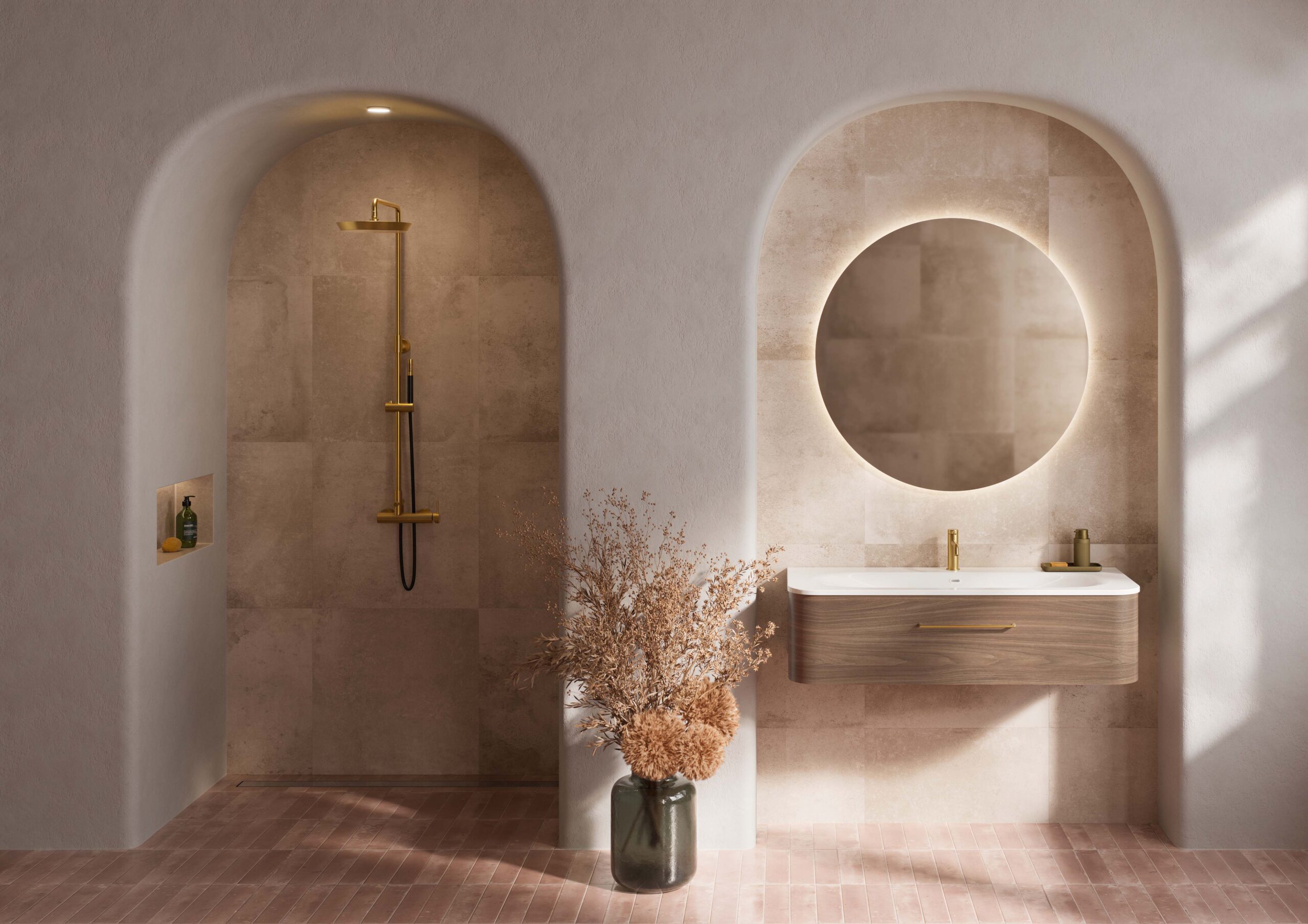 Miroir rond 4mm sur profil aluminium cintré en retrait en ABS intégrant LED périphérique protégée par couvercle transparent. Système antibuée intégré. Ruban LED 10,8W/m, câblé avec transformateur Classe II IP44, avec pitons de fixation.
