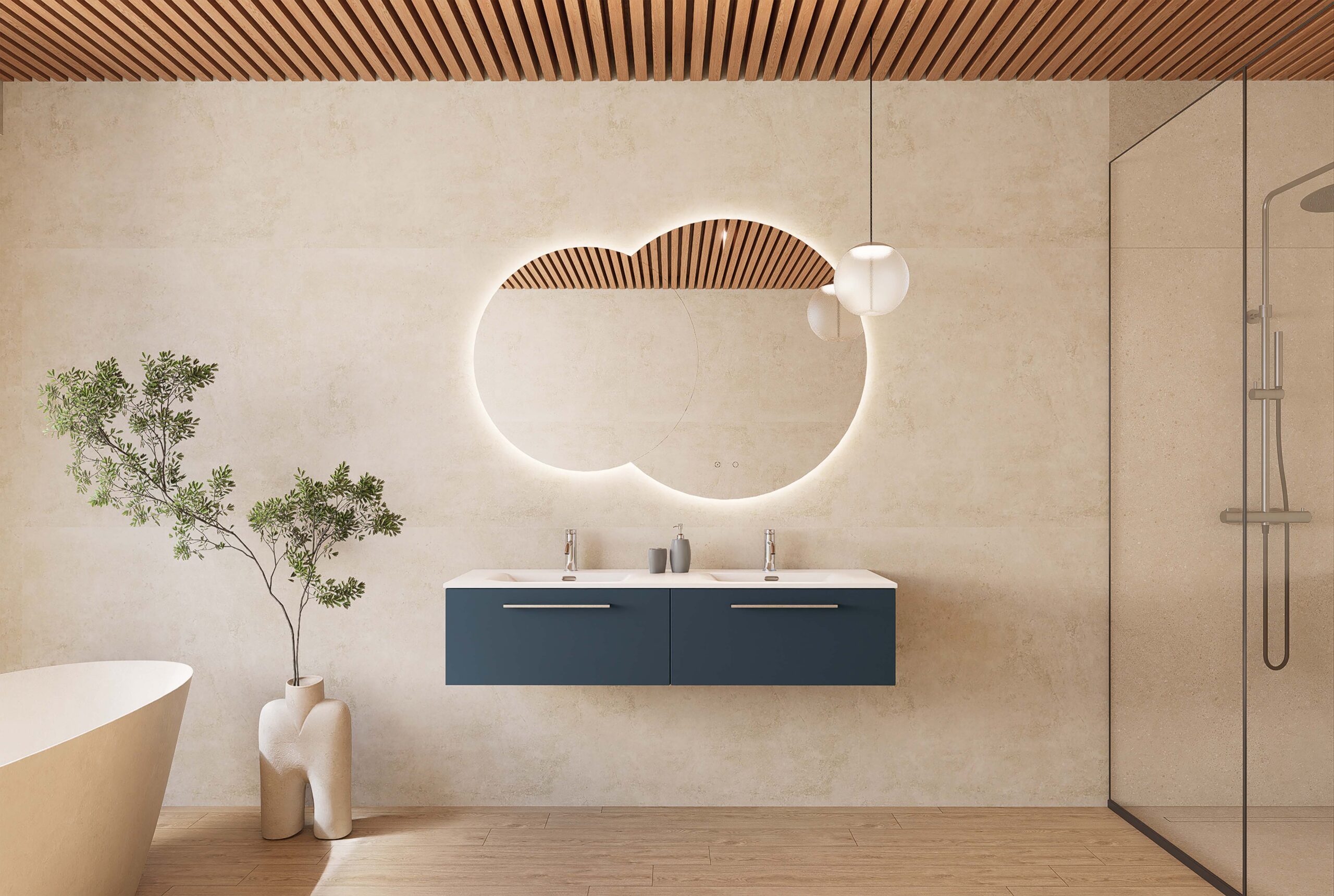 Miroir en retrait par rapport au cadre avec éclairage intégré LED, Classe II IP 44, LED 30W + anti buée 25W. Eclairage indirect dans cadre métallique laqué blanc mat. Système anti-buée avec extinction automatique au bout de 30 minutes. Interrupteur sensor tactile on/off/variateur et interrupteur changement de température.
