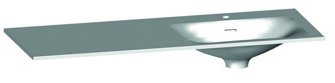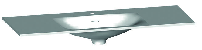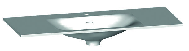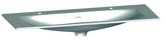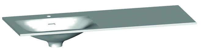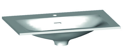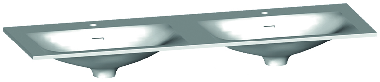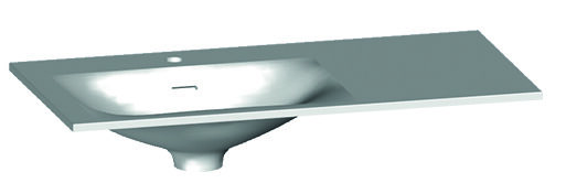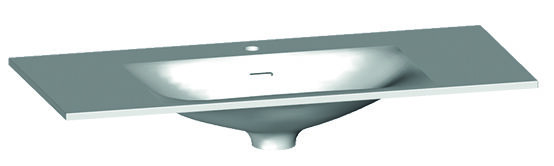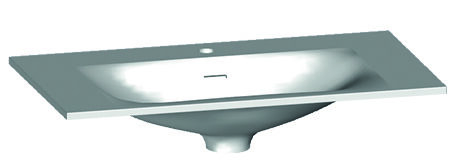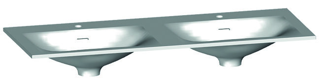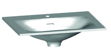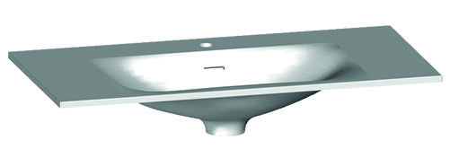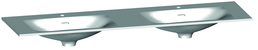 Plan vasque moulé en matériau de synthèse blanc brillant ou mat, composé de polyester et de carbonate de calcium avec un revêtement en surface Gel Coat de type ISO. Système de trop plein moulé. Possible sans perçage mitigeur sur demande.